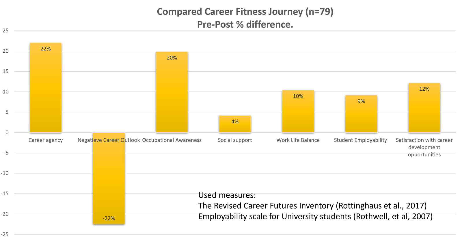 De Career Fitness Journey is geëvalueerd met een pre-post meting (n = 79) op basis van gevalidereerde vragenlijsten. De resultaten laten zien dat studenten na afloop gemiddeld rapporteren: